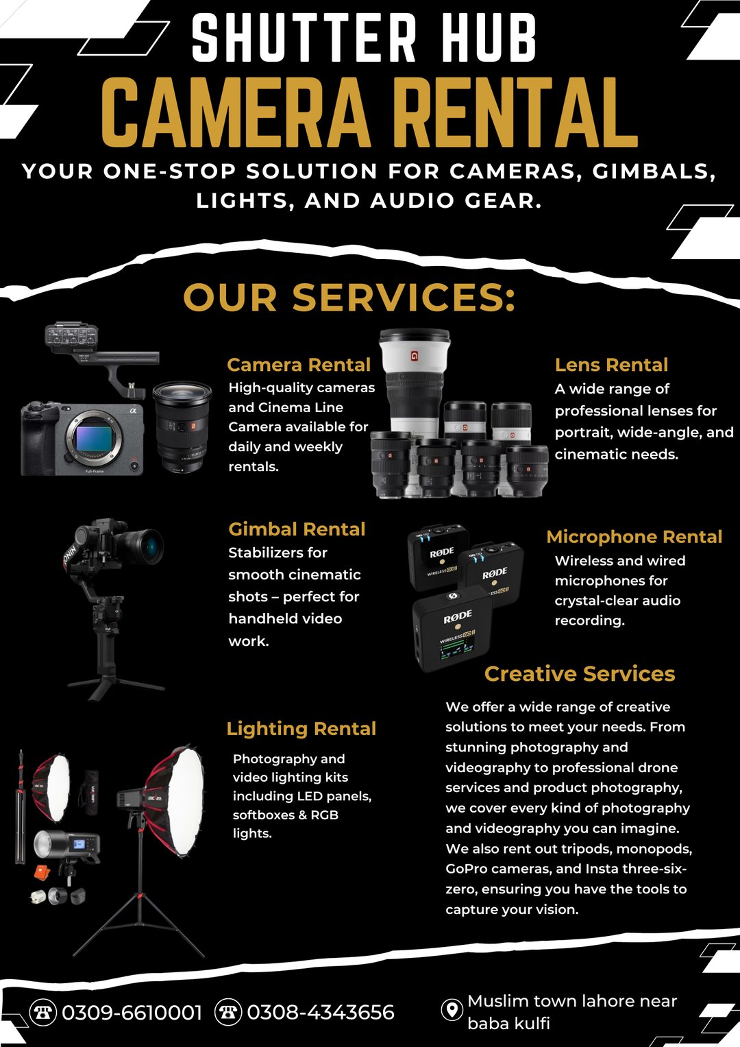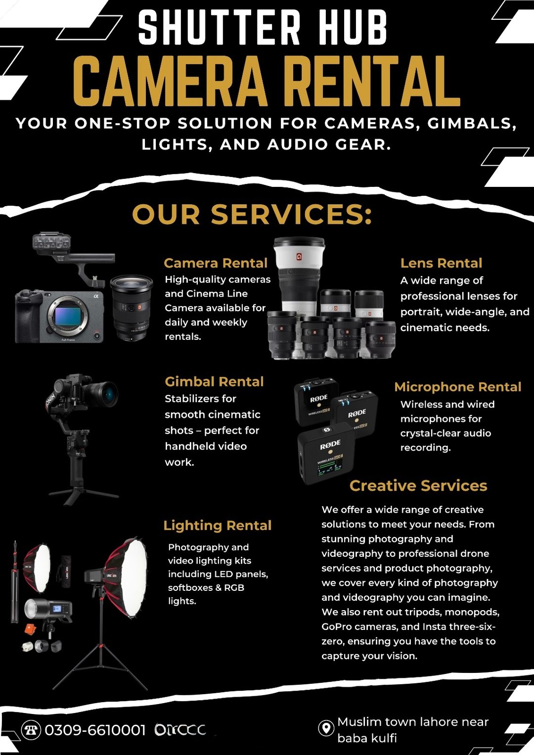 Discover your creative potential with Shutterhub Camera Rental Lahore, a one-stop destination for all your photography and videography needs since 2017. As a premier camera shop, we offer an extensive selection of professional-grade gear for rent, including cameras, lenses, and studio equipment. Our services extend beyond rentals to professional camera repairs, video editing, and a dedicated photography studio. Whether you're capturing a wedding or working on a personal project, our reliable service and top-tier equipment will help bring your vision to life.https://wa.me/923096610001
